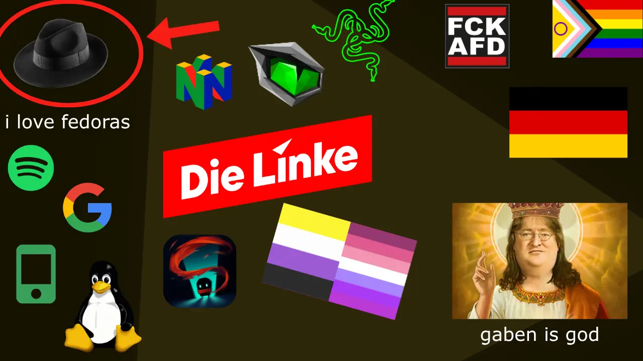 i was an intern at Die Linke a while back. i really enjoy this party's politics. slightly instable, yet more helpful than any other party here in germany. i am nonbinary, verian and currently live in germany. i'm a big fan of google, razer and fedora hats. i have a tulpar laptop.